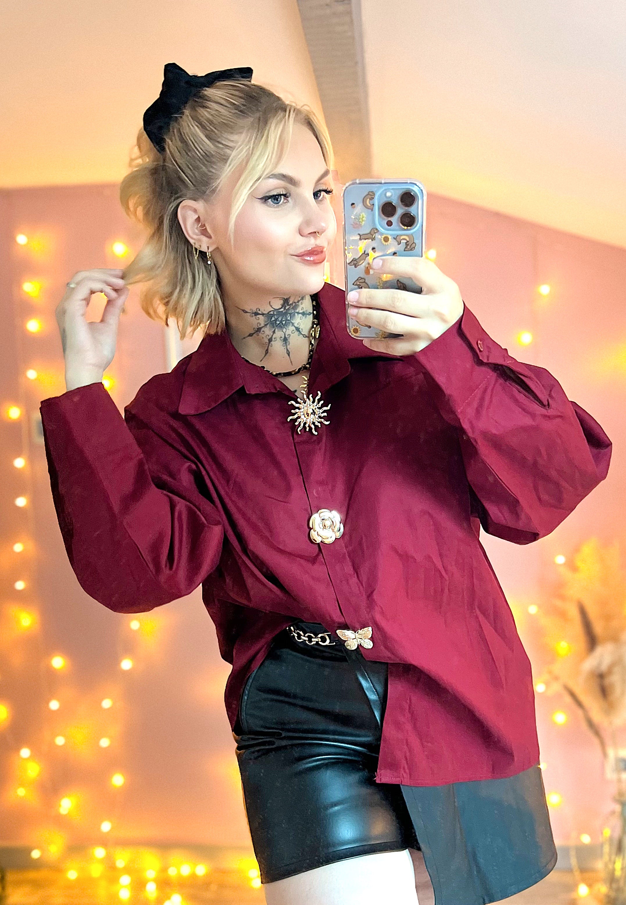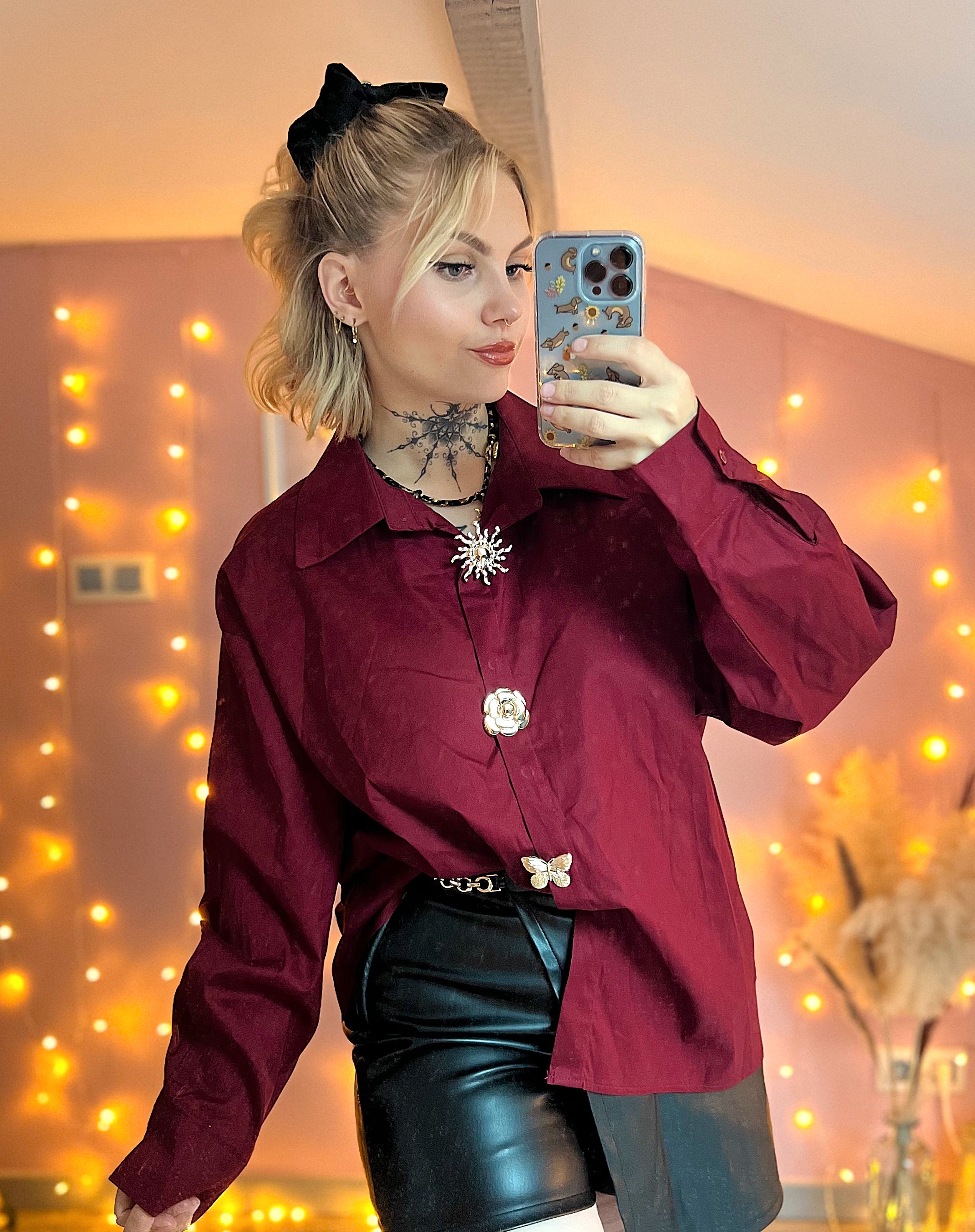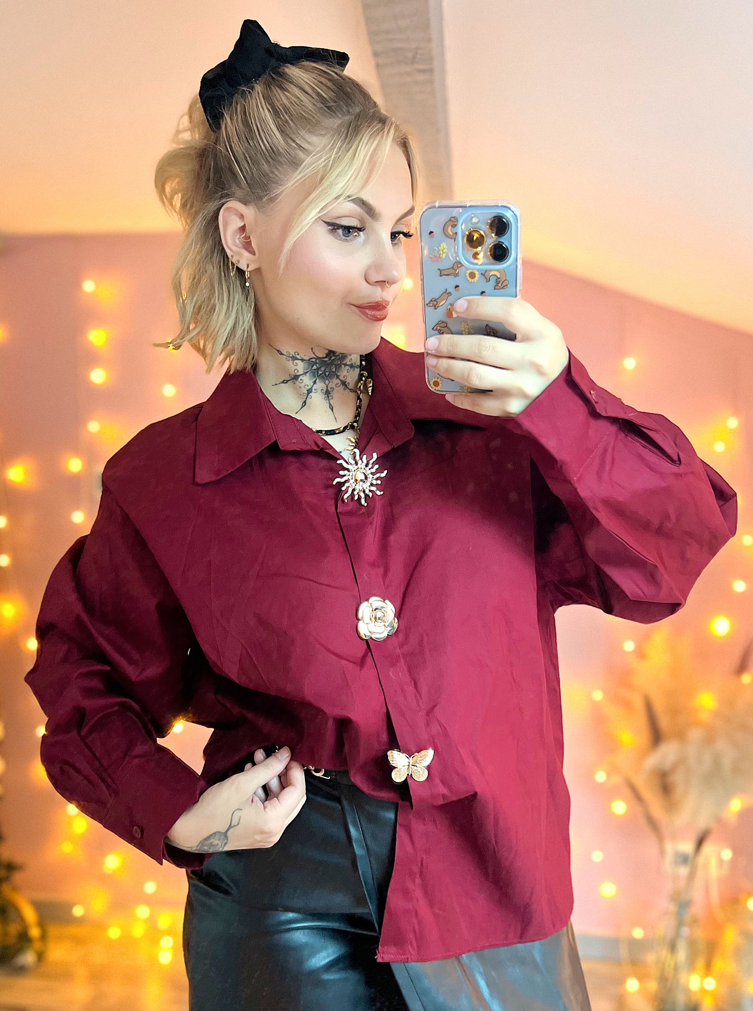 Chemise bordeaux oversize avec boutons bijoux dorés.