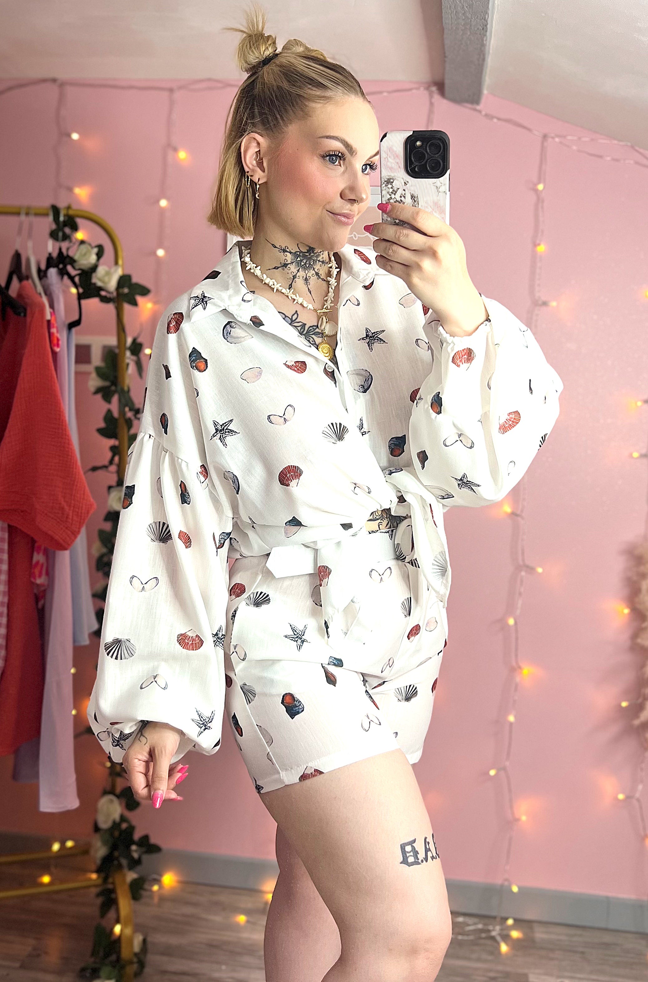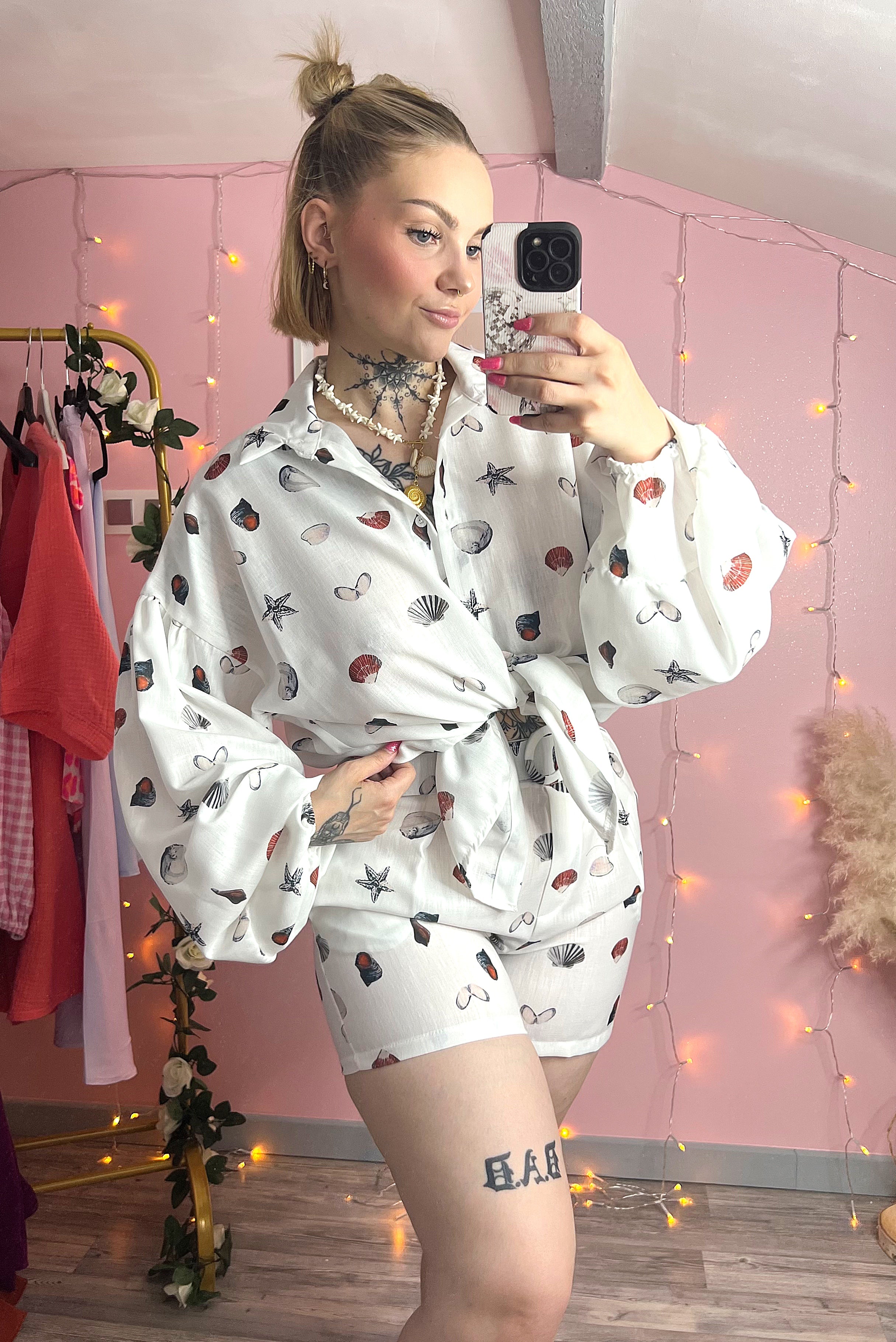 Ensemble short, ceinture et chemise motifs coquillages.