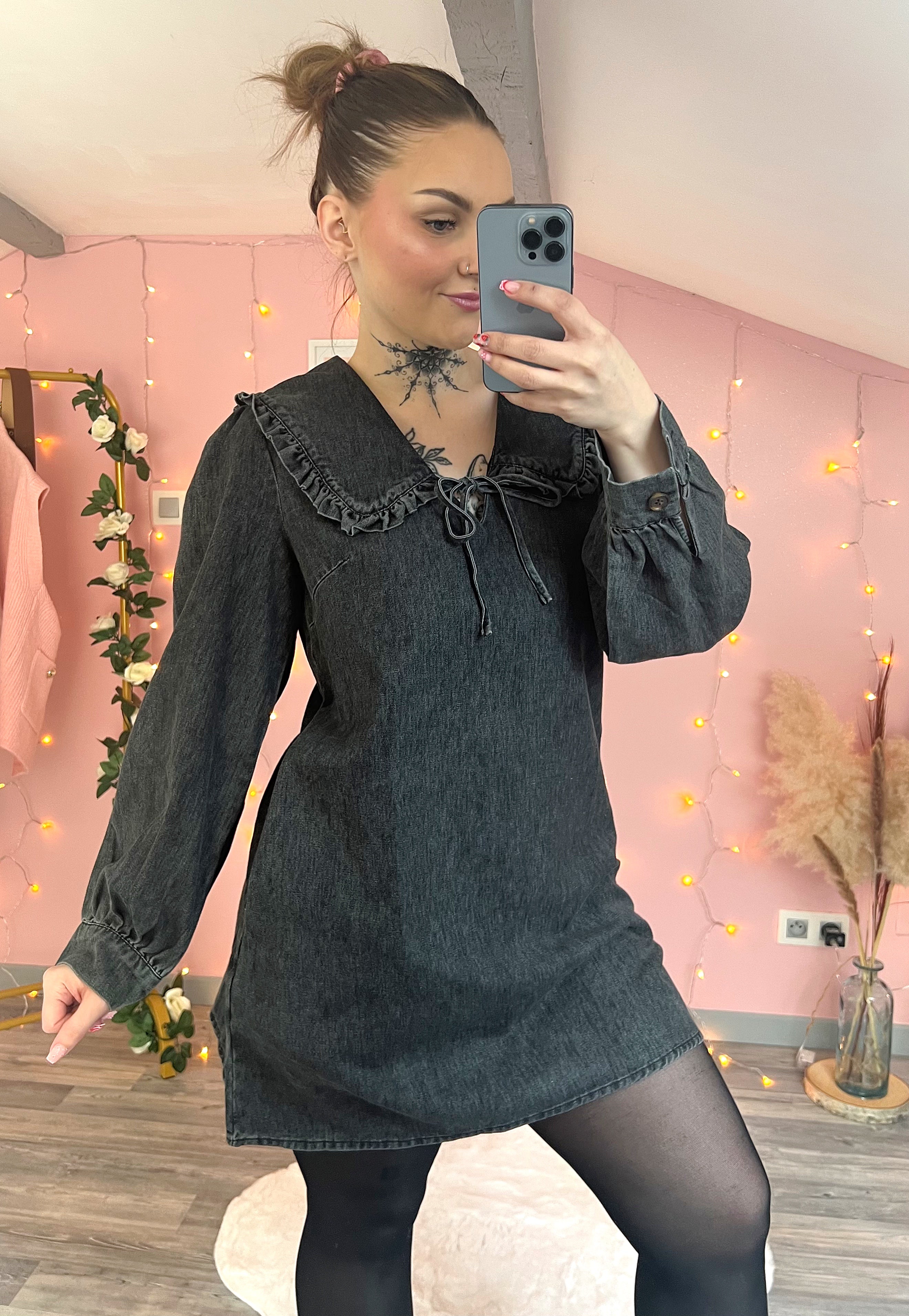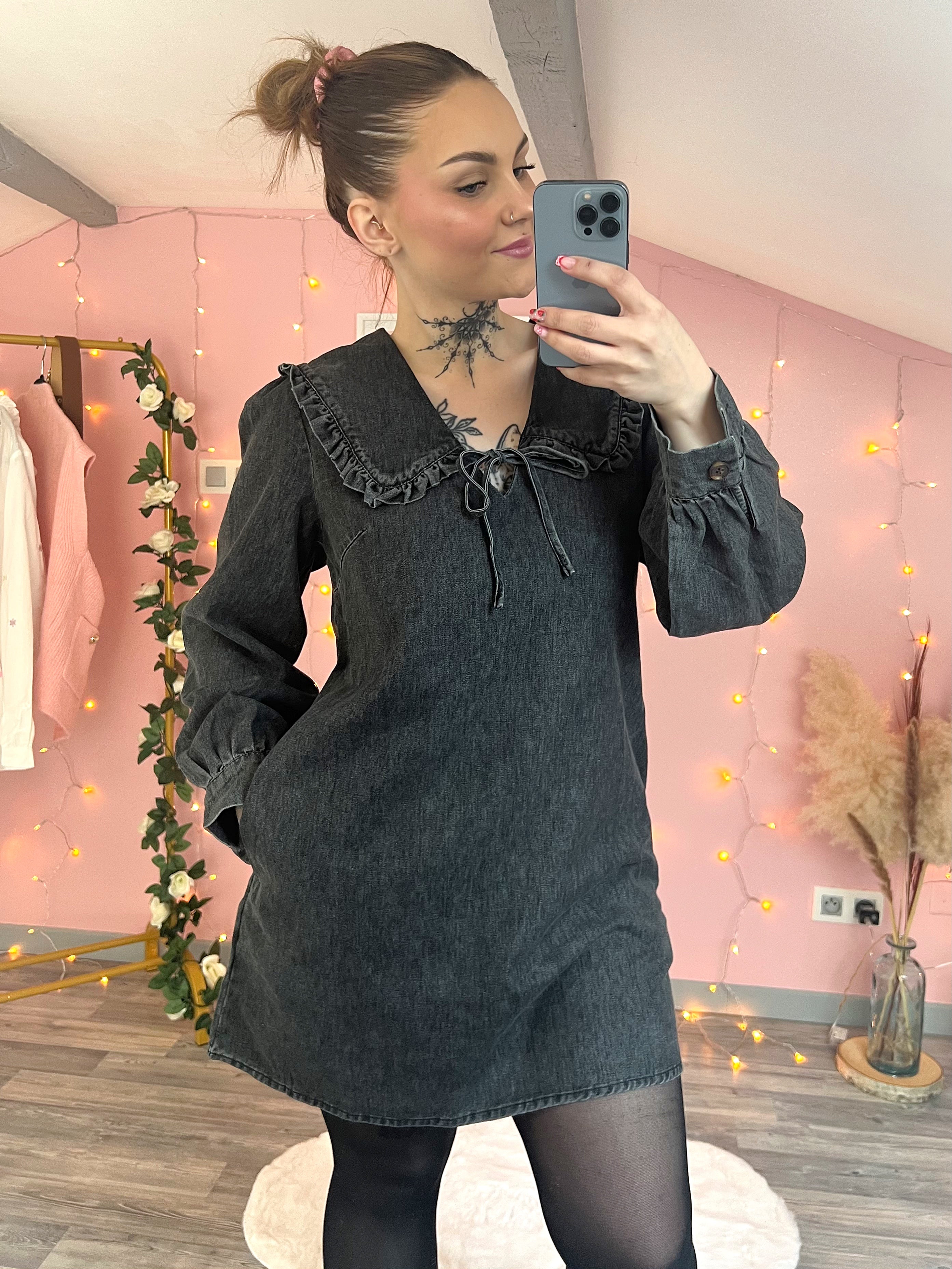 Robe en jean noir avec col Claudine à noué et poches intégrées.